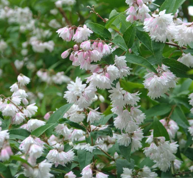 Cet arbuste est très apprécié pour sa croissance rapide et sa facilité de culture. Sa floraison le couvre de petits bouquets de fleurs doubles, d’abord rose tendre puis devenant blanc. Son écorce de couleur cannelle s’exfolie à l’âge adulte. Parfaitement rustique, il est peu exigeant en matière de sol. Son port est érigé dans ses jeunes années et s’évase avec l’âge. Ses feuilles sont vert mat assez foncé, pubescentes et rugueuses d’où son nom « scabra » qui signifie rugueux en latin.